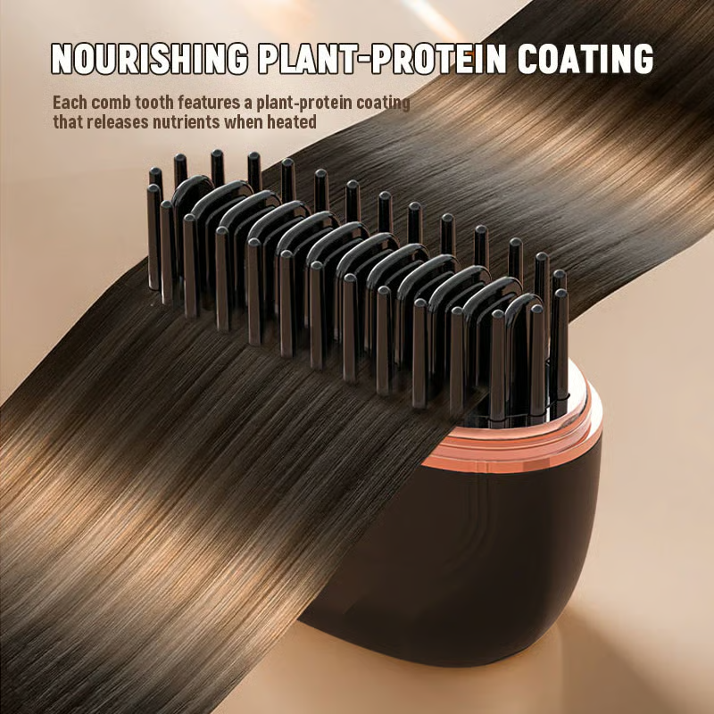 تتميز كل أسنان المشط بطبقة من البروتين النباتي تطلق العناصر الغذائية عند تسخينها - مما يقلل من التجعد ويمنع التلف ويترك الشعر ناعمًا ولامعًا وصحيًا. 🌱💆♀️